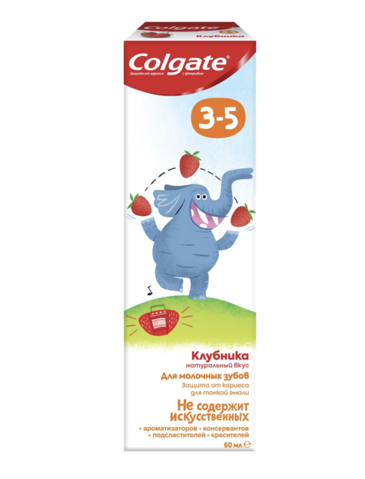 АО «Колгейт-Палмолив». Новая детская паста от любимого бренда COLGATE 3 – 5 предназначена для ухода за молочными зубами малышей. подходит для детей от 3 лет, 4 лет и 5 лет. Не содержит SLES, парабенов, глютена, сахара. Не содержит агрессивных абразивных частиц. 100% натуральный вкус. Соответствующее возрасту содержание фторида. Не содержит искусственных ароматизаторов, подсластителей, консервантов, красителей. подходит как для девочек, так и для мальчиков. Внутри каждой пачки: Красочная брошюра с календарем для чистки зубов, полезными советами для мамы и увлекательными материалами для ребенка. Любимый вкус клубники придется по вкусу вашему малышу и поможет мотивировать ребенка к регулярной гигиене полости рта. Первичной упаковкой продукта является картонная упаковка. Целостность первичной упаковки обеспечивается запаиванием картонной упаковки в момент производства.