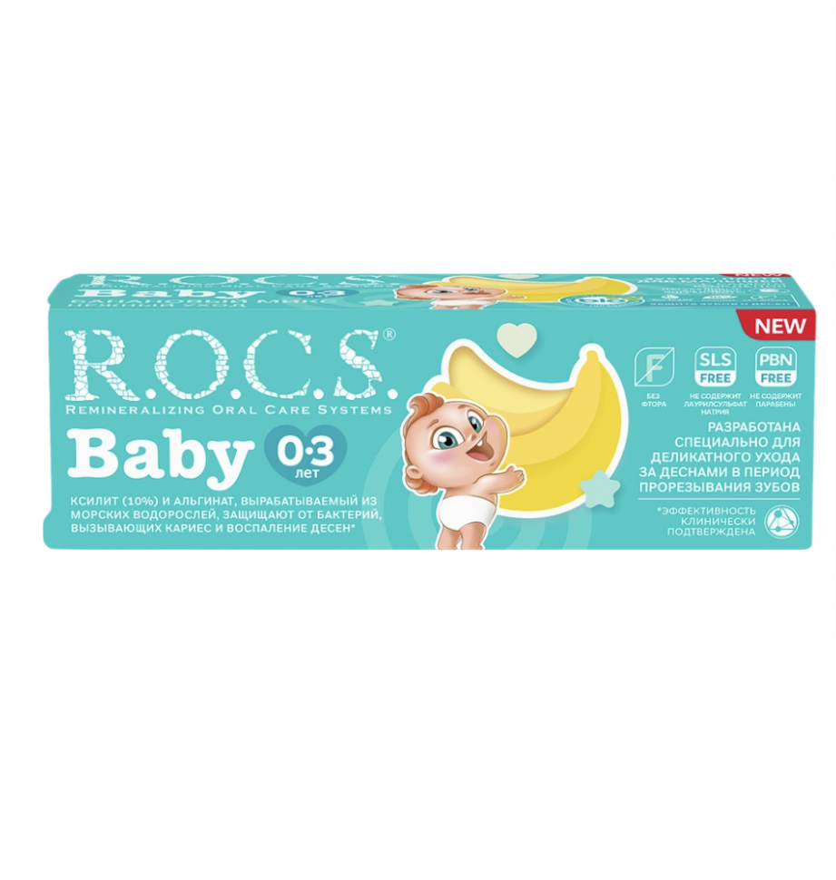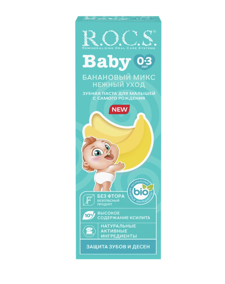 ООО «Еврокосмед-Ступино». Зубная паста детская R.O.C.S. Baby Нежный уход Банановый микс, 0–3 лет специально разработана для деликатного ухода за деснами в период прорезывания зубов. Находящиеся в составе ксилит (10%) и альгинат, вырабатываемый из морских водорослей, защищают от бактерий, вызывающих кариес и воспаление десен.