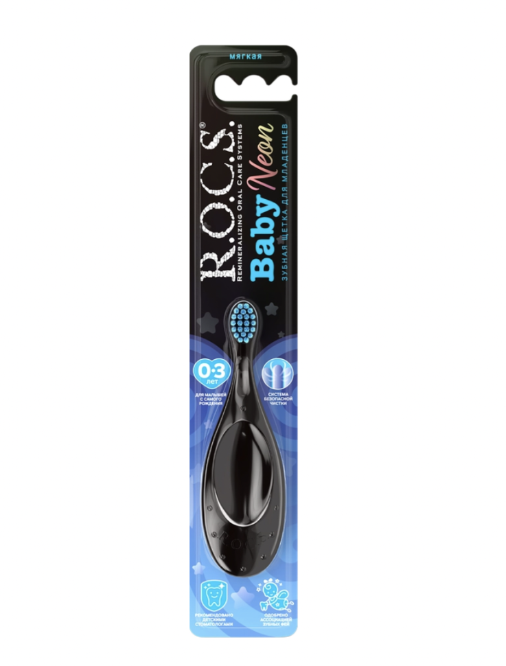 Блистер. Зубная щетка детская R.O.C.S. Baby Neon мягкая 0–3 лет имеет мягкую щетину с уникальной тройной полировкой кончиков, которая не повреждает нежную десну и незрелую эмаль зубов малыша. Количество щетинок в пучке увеличено в 1,5 раза, что обеспечивает эффективную чистку зубов. Структура и однородность пластика препятствует задержке бактерий на поверхности ручки. Широкая форма ручки разработана для удобства и безопасности малыша.