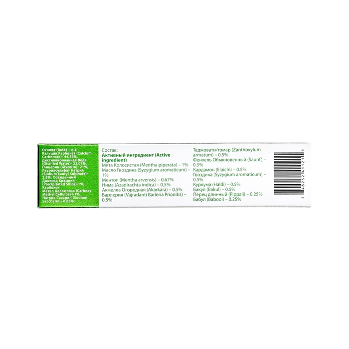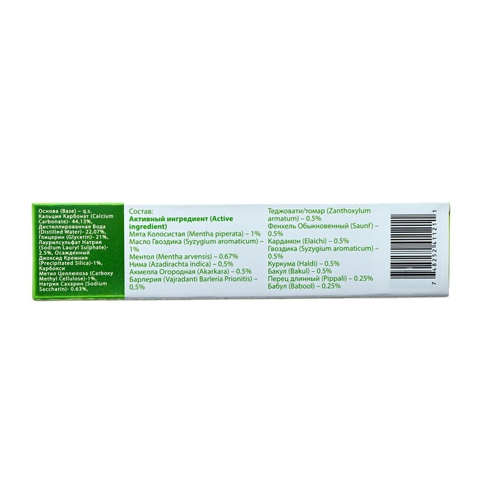 Состав: мята колосистая (mentha piperata) — 1 %, масло гвоздики (syzygium aromaticum) — 1 %, ментол (mentha arvensis) — 0,67 %, ним (azadirachta indica) — 0,5 %, акмелла огородная (akarkara) — 0,5 %, барлерия (vajradanti barlelia prionitis) — 0,5 %, теджовати/томар (zanthoxylum armatum) — 0,5 %, фенхель обыкновенный (saunf) — 0,5 %, кардамон (elaichi) — 0,5 %, гвоздика (syzygium) — 0,5 %, куркума (haldi) — 0,5 %, бакул (bakul) — 0,5 %, перец длинный (pippali) — 0,25 %, бабул (babool) — 0,25 %.