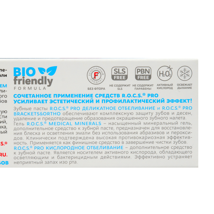 R.O.C.S. PRO OXYWHITE «Кислородное отбеливание» — дополнительное средство к зубной пасте. Является носителем атомов кислорода, которые обладают осветляющим и бактерицидным действием. Эффективно устраняет неприятный запах изо рта.