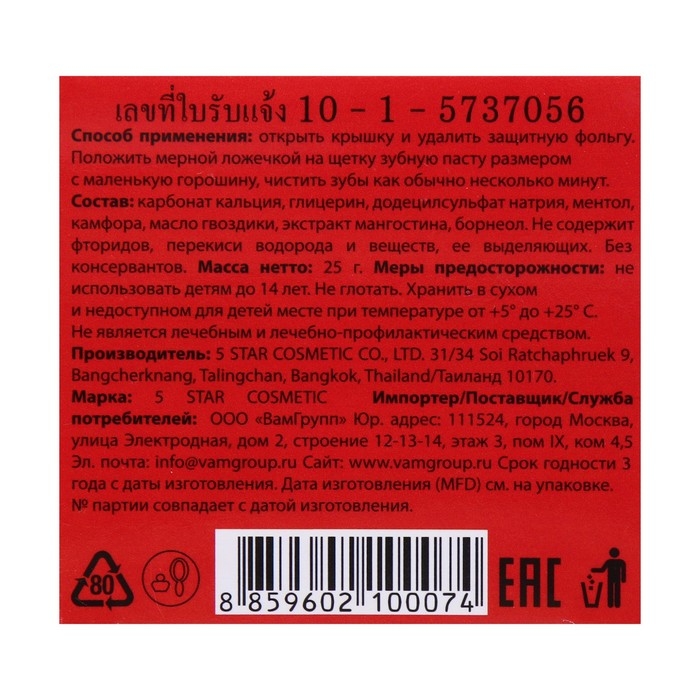 Зубная паста с экстрактом Мангостина 5 Star Cosmetic травяная, 25 г *2шт