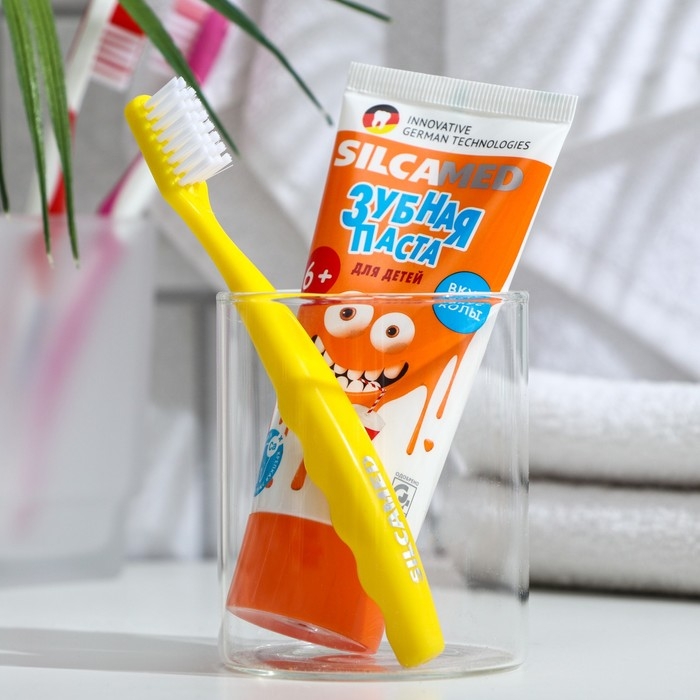Зубная паста для детей SILCAMED в комплекте с щёткой понравится и маме, и ребёнку! Паста предназначена для детей с начавшейся заменой молочных зубов. Активный кальций укрепляет эмаль, а фтор надежно защищает от кариеса. Липа и ромашка снижают дискомфорт дёсен, мягко ухаживают за полостью рта.
