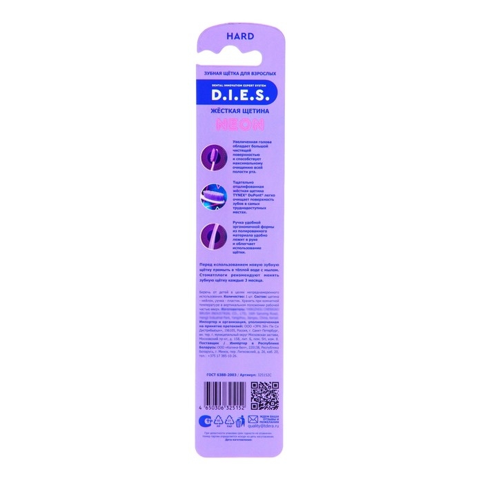 Зубная щетка высокой жесткости быстро удаляет зубной налет и деликатно отбеливает эмаль. Специальная форма головки облегчает доступ к дальним жевательным зубам.Зубная щетка D.I.E.S. NEON – отличный выбор для комплексного ухода за полостью рта.