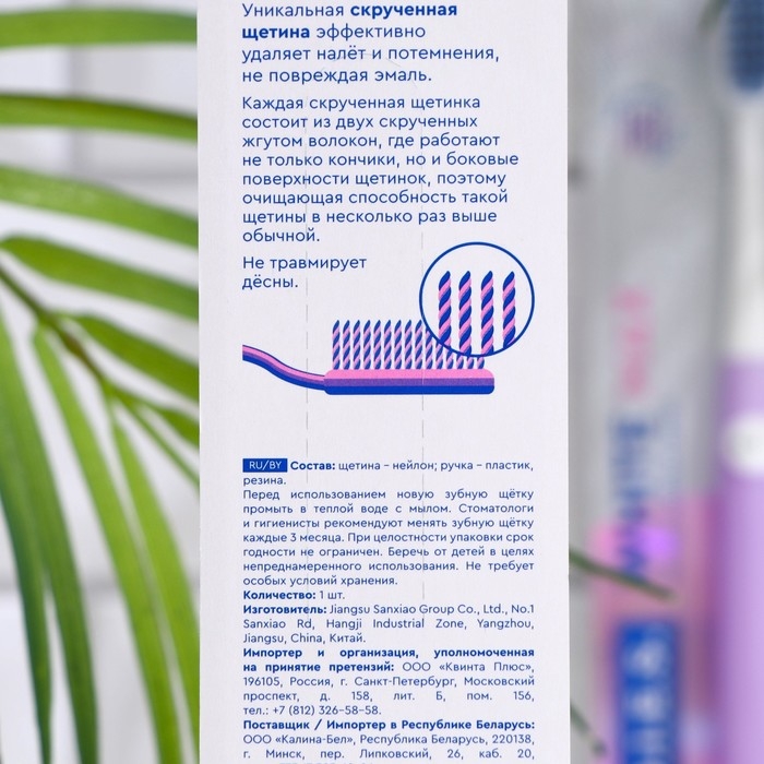 Описание: зубная щетка "D.I.E.S. WHITE MAX" против налета и пятен. Каждая скрученная щетинка состоит из двух скрученных жгутом волокон, где работают не только кончики, но и боковые поверхности щетинок. Поэтому очищающая способность такой щетины в несколько раз выше обычной. Закруглённый кончик каждой щетинки тщательно отполирован, поэтому щётка не повреждает дёсны и эмаль. Ровная форма подстрижки щетины увеличивает рабочую поверхность, обеспечивая максимальный контакт со всеми участками поверхности зуба и качественное удаление зубного налёта. Эргономичная ручка, покрытая силиконом, обеспечивает отсутствие скольжения во время использования.