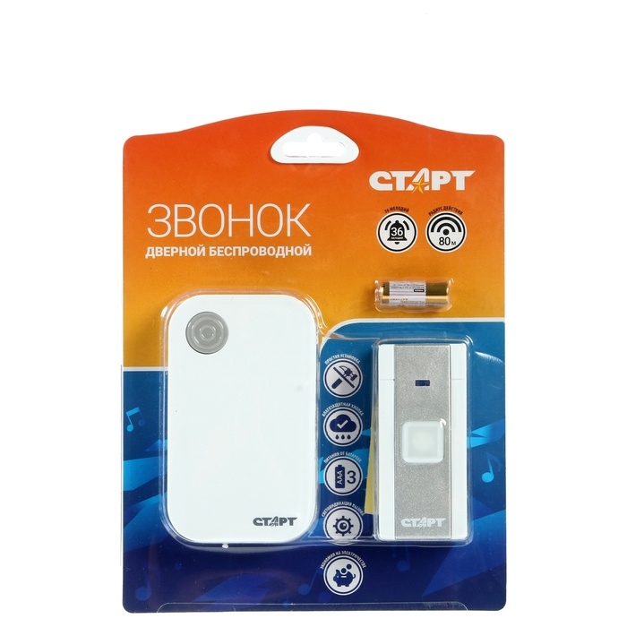 Звонок СТАРТ Б/З 009, беспроводной, 36 мелодий, 80 м, 3xAAА (не в комплекте) /1xA23, белый